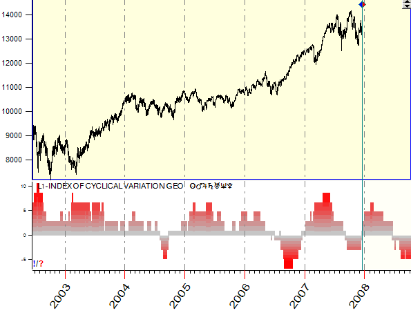 We can apply this idea to any planetary pair, not only the Moon - the Sun. As an example, we can say that the Sun and Jupiter form the waxing angle between their conjunction and opposition while the waning angle between the Sun and Jupiter goes from their opposition to the next conjunction. I know two indicators based on the balance of waxing/waning planetary angles. First of them is Guneau Index; it is calculated by adding the angle of separation between the planets for waxing pairs and extracting for waning pairs. Another index is Index of Cyclical Variations; it is calculates as a difference between the amount of waxing and waning planetary pairs. The higher this indicator the more waxing planetary pairs we have. Even a general glance at these indicators proves that they are pretty useful to reveal the stock market behavior.