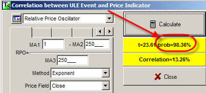To be sure that this fact is not occasional, I have conducted the statistical analysis. It shows that the probability that this indicator correlates to the oscillation of Dow index is 98%: