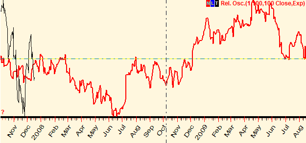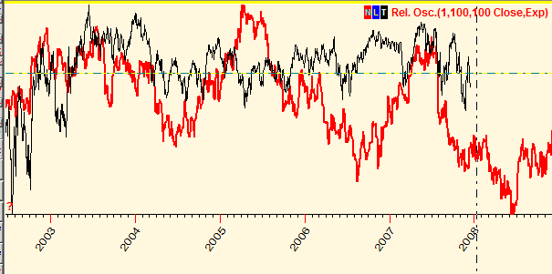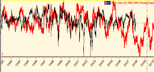 In order to do that with Timing Solution software, run the Neural Network (NN) module and train this NN using waxing/waning events as inputs for the neural net (inputs are things the forecast is based on). As output (what to forecast), I use the relative price oscillator with period 100 bars. After training I have got this projection line (the red line):