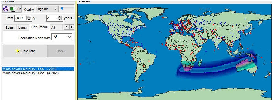 The picture above shows the occultation path for Moon-Mercury coverage. On February 5, 2019 Moon has covered Mercury (conjunction in both longitude and latitude); this phenomenon was visible at certain locations. More information about this module is here: http://www.timingsolution.com/TS/Mini/19/index.htm |