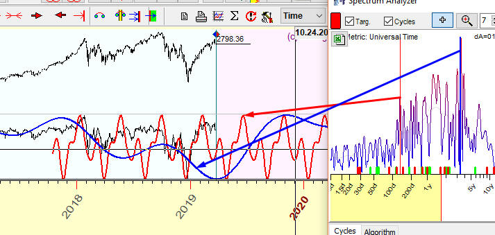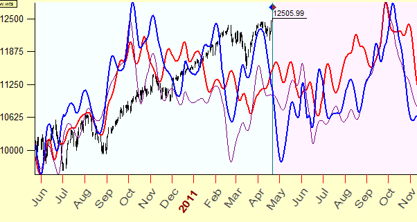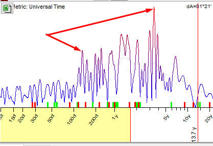 The highest and most narrow peaks on this diagram correspond to the most powerful cycles that are present within this data set. You can choose them one by one and see how they work (red -131 days, blue - 41 months cycles) :