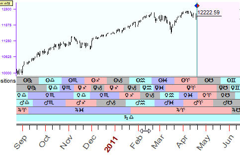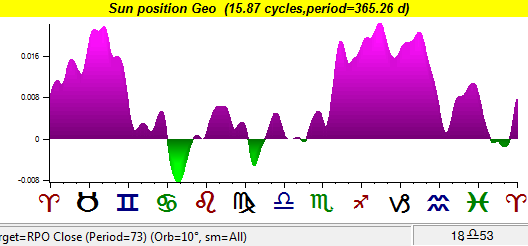 Composite module. This module allows to reveal astronomical cycles in financial data and generate a projection line based on these cycles. As an example, look at this diagram that shows the average changes of Dow Jones Industrial Index when the Sun is located in different signs of Zodiac: