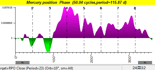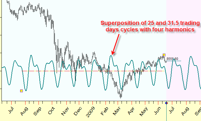 The example above shows vertical lines that correspond to changes of Mercury-Earth heliocentric angle by steps of 620 degrees. In a similar way, any planetary combination and any angle can be applied. The simplest cyclical analysis can also serve as a charting tool. This is an example of a superposition of 25 and 31.5 trading days cycles with four harmonics: