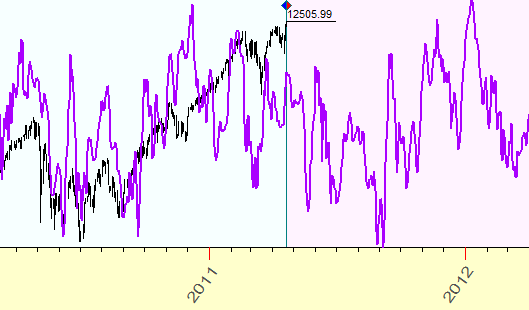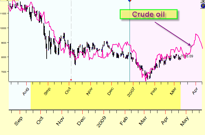 Similar periods finder. This is a very powerful module that allows to reveal similar periods in the past and make a future forecast based on this information. It is better to illustrate the general idea of this module with some simple example. Let say that we are looking at the price chart on April 23, 2009. We are there, in that day. We do not know what will happen after it (actually, this note and the example were done at that day). So, we are looking at the price chart and trying to anticipate what the current market condition promises in the nearest future. Though we cannot forecast the future 100% accurate, it is possible to find some analogies in the past to get some clues in this regard. Here I have combined together these two charts: