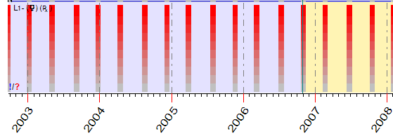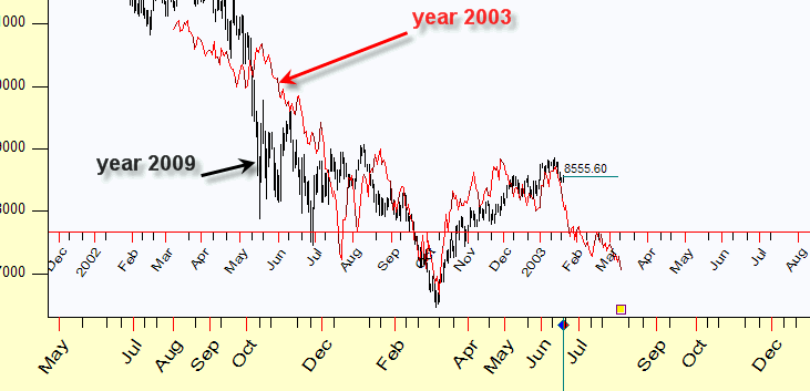 One of the modules in Timing Solution is designed to search similarities in price patterns. As a result, we have Price chart slice charting tool. It is very simple to use if you have some idea like "the current price chart is similar to the price chart some time ago". As an example, for the current price we used the chart for June, 2009 and compared it to some chart for January 2003 (the dates and charts were chosen randomly, just to illustrate the idea). The older chart overlays the "current" price char. You do that by dragging this piece of the price chart with the mouse: