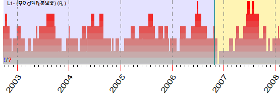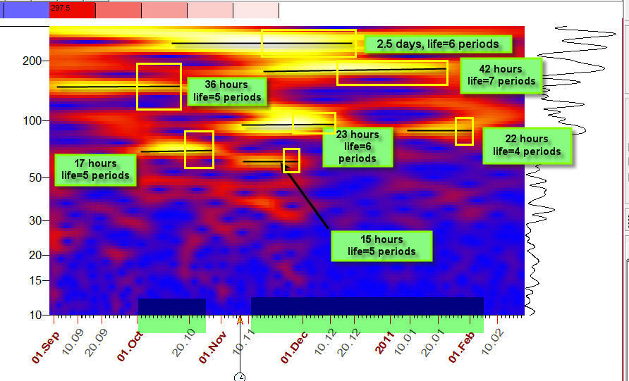 Wavelet. Wavelet module allows to visualize the appearance and disappearance of cycles in financial data. The advantages of this approach are: 1) you can see the whole life cycle of "cyclical mode", i.e. to see how the cycle was born and how it died; 2) you are able to reveal the newly appearing cycles as early as possible. Yellow horizontal stripes on the diagram below represent the periods when X cycles are active. You should be especially attentive seeing new horizontal stripes, as they correspond to the moments when new cycles appear.