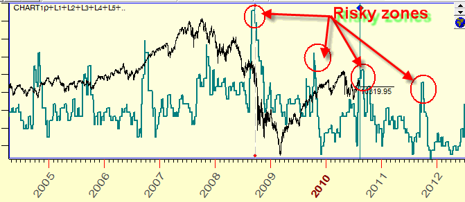 Now, having this information, we can construct "risky index" to forecast dangerous zones (when a lot of things in the stock market activity resemble 1929, 1987 and 2008 years). Here it is: