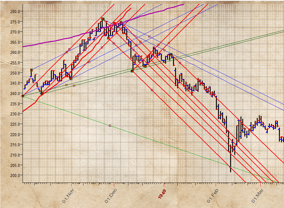 Precise Charting module: This module models paper style charting, the charting procedure that traders used to do 100 years ago. Look at this famous Gann chart for soy beans made in 1949: