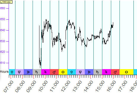 It shows planetary positions in different signs of Zodiac, together with market data, for a chosen time period. Or this example showing periods of direct/retrograde planetary movements: Or this one that shows planetary hours for intraday data.: