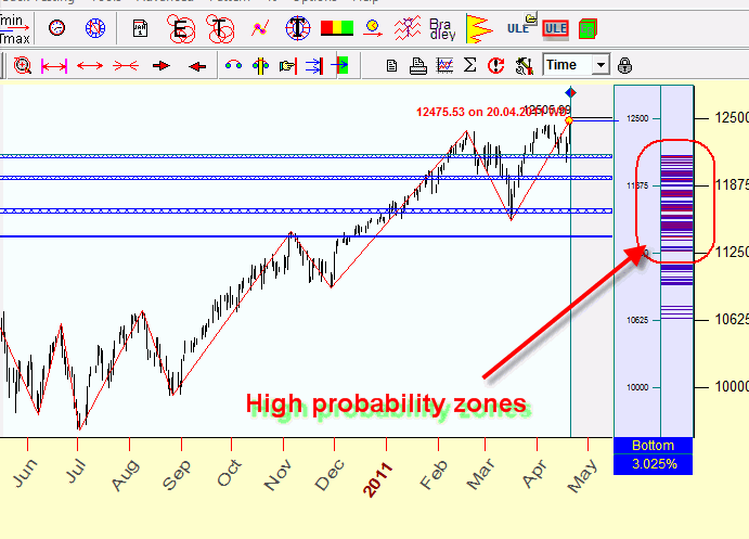 Turning points analyzer. This module allows to reveal support and resistance levels using the information based on statistical analysis of the turning points in the past. Here is an example: the program analyzes 177 turning points for DJII since 1995 (3% zigzag is used) and shows high probability zones, i.e. price levels where the next turning point may occur: