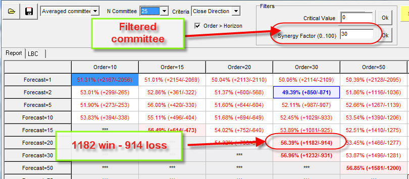 In this particular case the averaged committee filtered line shows the correct movement for 20 bars ahead (i.e. one month) with the probability 56.39%.