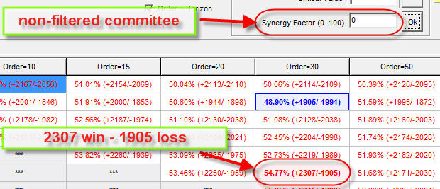 filtered committee line with synergy factor 30 and higher works better than non-filtered (see the pictures below).
