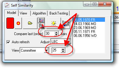 The program starts working in the "self similarity" mode. Instead of comparing different price charts (like Dow and Crude Oil), it is looking for the similar patterns using only the downloaded price history.