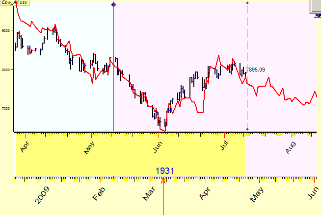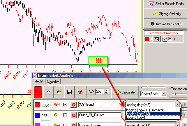 You may specify the interval for comparison. In the example below, only last 100 price bars of Dow data are used to be compared with Crude Oil chart. 100 price bars means 5 months. Let say that we have found a model and the similar periods. Now let us expand the initial interval. Do it this way: