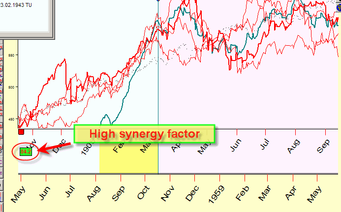Below you can see another example with high synergy factor 84.2, all four red lines point approximately at the same movement: