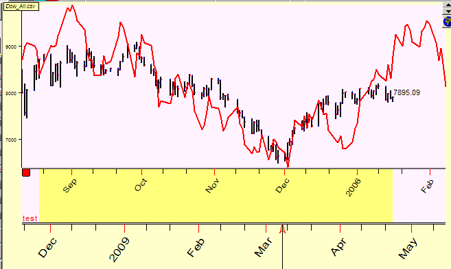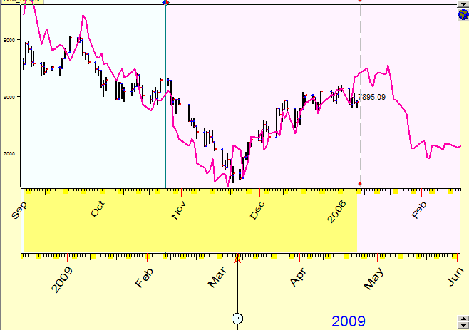 The program shows that there is some similarity between Dow now (April 2009) and Crude Oil in the beginning of the year 2006. This similarity period is marked by yellow bar in the Main Screen. Let's magnify this piece of the price chart to see the details: