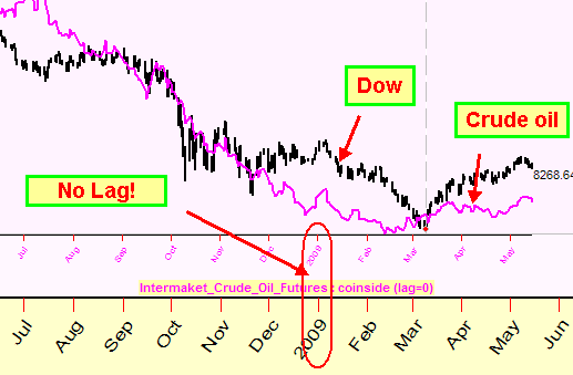 Look at the graph below. There the last year crude oil price correlates very well (no lag) to Dow Jones Industrial index (black - Dow, purple - Crude Oil):