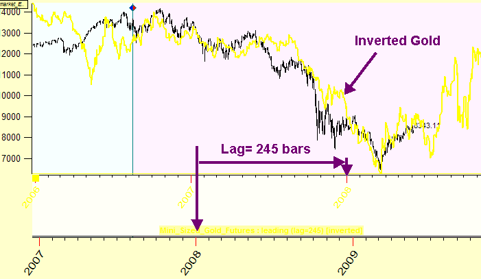 The gold price works as INVERTED LEADING indicator with lag 245 bars.
