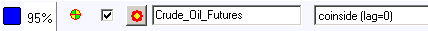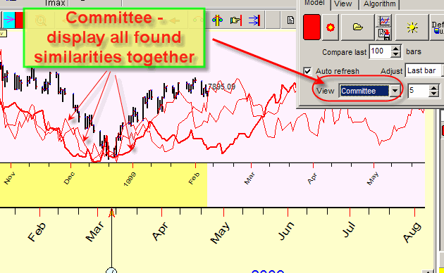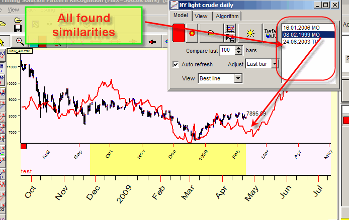 Highlight any of these periods to see the similarity pattern in the Main Screen (the picture above shows the similarity between Dow now and Crude Oil in the year 1999). Try another period. The according chart will be displayed in the Main Screen. Where the similarity period ends, you get your hint regarding the future movement of Dow. We may make the assumption as the price chart for Crude Oil continues, and we can rely on it. So, instead of calculating the projection line, you make a reasonable guess.