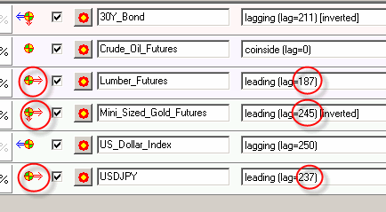 As an example, 30 year bonds can be considered as an inverted lagging indicator (lag 211 bars) and a leading indicator (lag 243 bars). I recommend to explore these options manually; the formal math approach does not see all nuances that any trader sees.