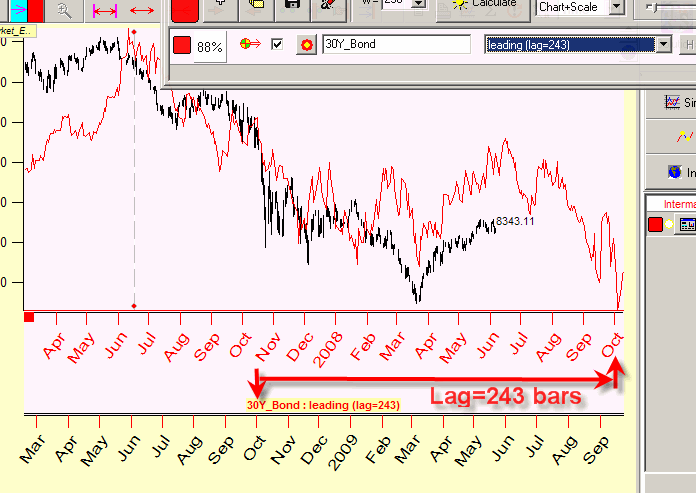 This is how 30 years bond works as LEADING indicator with lag 243 bars: