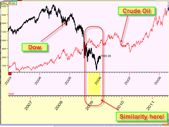 See here the price chart for the current situation (April, 2009) for Dow (a black chart) together with the price chart for crude oil in 2006-2007 (a purple chart):