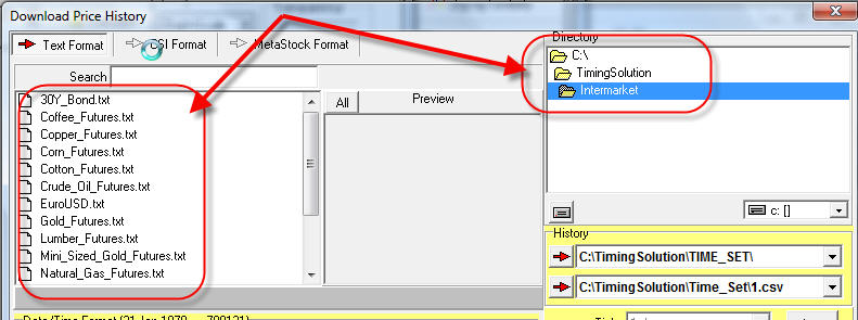 There are two possible options there: text/Metastock/CSI files or e-Signal datafeed. Choosing "From File" option, you will get the standard Timing Solution window to download the price history.