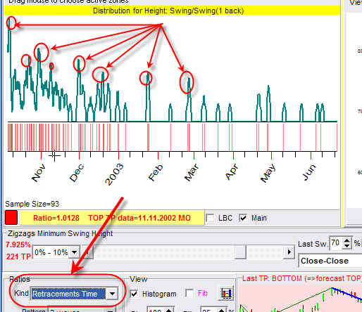 This option sets the last completed turning point as a bottom (September 30, 2002) and conducts the research looking for the next top. Formally the point Sep. 30, 2002 is not a bottom because we do not have enough uptrend movement to confirm it. We set this point manually: "If Sep. 30, 2002 is a bottom, what would be the most probable level for the top?".