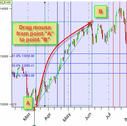 The Andrews pitchfork requires three anchor points. Some charting elements require two anchor points only. For example, to draw the Fibonacci grids, simply drag the mouse from one anchor point to another: