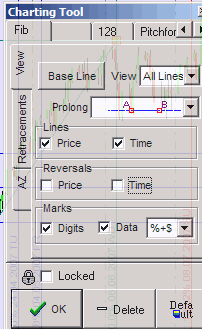 Timing Solution has a great variety of them. You will find there the simplest ones and the most popular ones - such as trend lines, Andrews pitchforks, Fibonacci levels, Gann fans, etc. We went even further - Timing Solution offers new charting tools, or "smart" charting tools. These charting tools are quite simple in use while having complicated math behind. Due to the large amount of Charting Tools available, this lesson will only discuss the more widely used ones. A full explanation of all the Charting Tools available in Timing Solution can be found here.