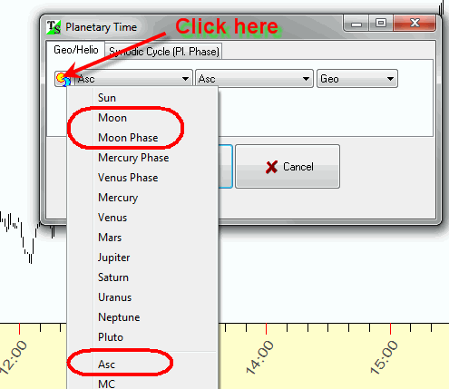 Imagine now two friends. One of them lives in New York, while the other lives in Moscow. Both are looking at the Moon at the same time and measure accurately the Moon's position. They will be surprised as the position of the Moon will be different. This difference can reach 1 degree in longitude. It is called "parallax". For intraday trading models this difference can be critical, so you may set the parallax for astronomical calculations through "Options" in "Astronomy" tab: