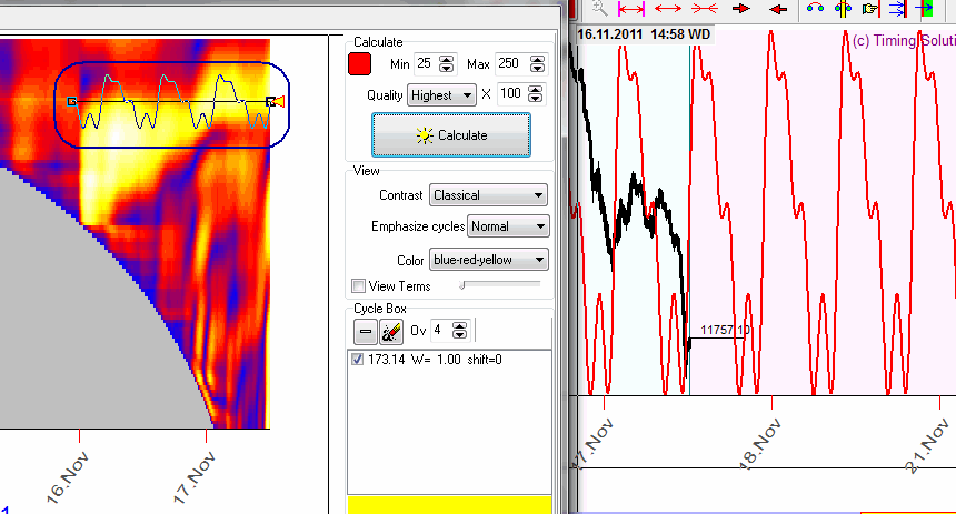 In wavelet module you can see the birth of new cycles. You can see them on the wavelet diagram as bright regions. So, dragging the mouse cursor over this region you immediately get the projection line for this cycle together with the price chart, like this: