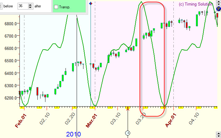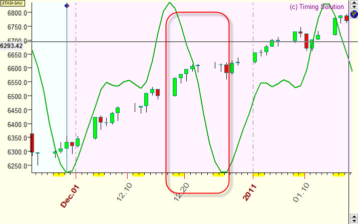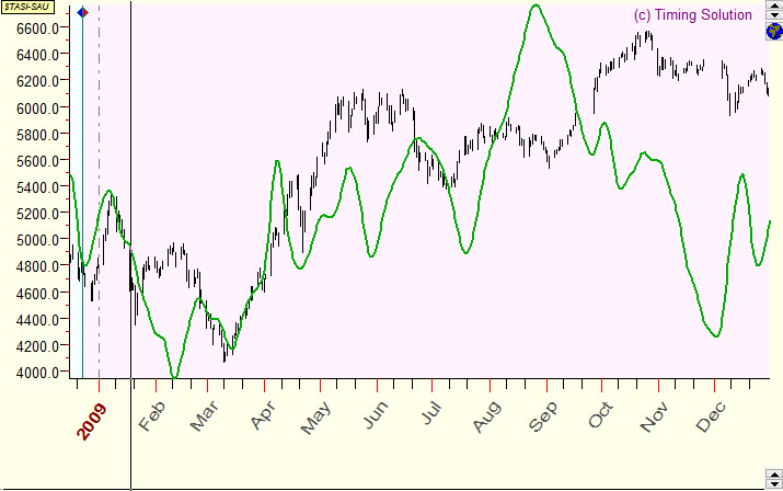 Below are random examples of verified projection lines together with corresponding price charts. Samples are done for Saudi Arabia All share index (TASI), and as a model for projection lines the Moon based cycle is used. The average forecast ability of this cyclic model is 10% (correlation=0.1). Usually, though they do not explain everything, such projection lines (with the correlation around 0.1) reflect some market movements that can be seen on the price chart. This info alone is not enough for successful trading; however, it contains a unique information that cannot be obtained by other methods of analysis.