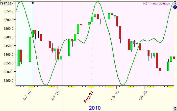 In most cases the projection line forecasts not the price itself; it forecasts turning points mostly. As an example, let us consider the projection line based on Annual cycle and the price chart for the last five years: