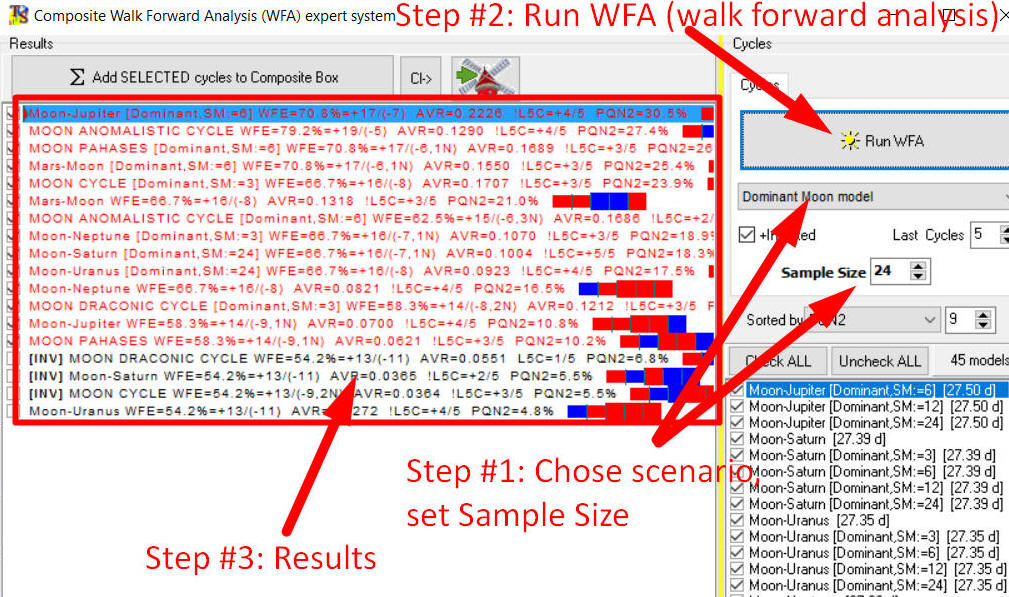 In this window choose a scenario, i.e. cycles you plan to analyze (Step #1). Then click "Run WFA" button (Step #2), and after some time while the program does necessary calculations, you will get the list of ranked astro cycles. Now we can work with these cycles (Step #3):