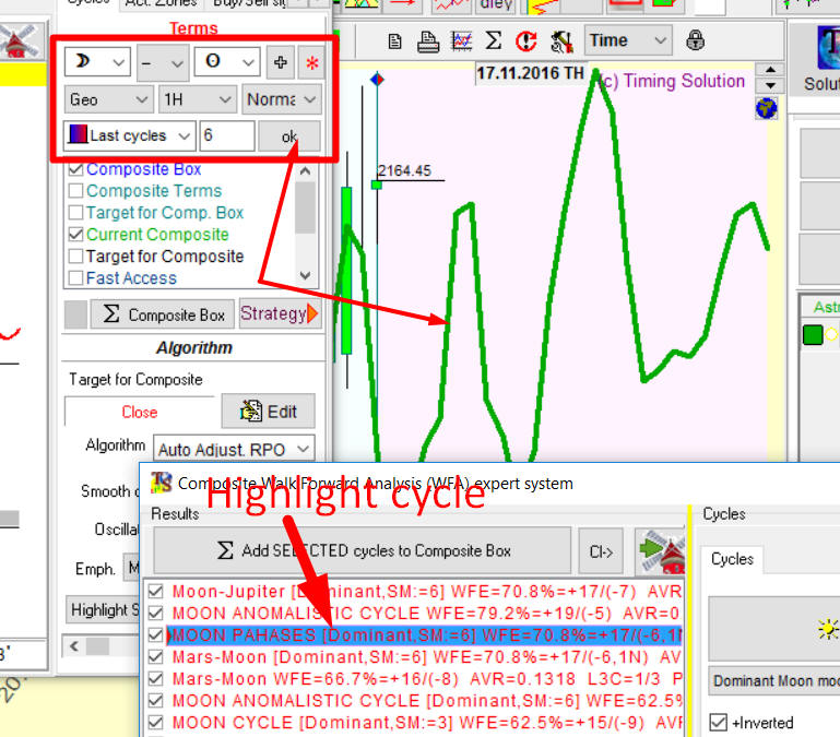 Now we can work with these cycles. Simply highlight any cycle from the list; the program immediately will set this cycle in Composite module, and its projection line will be displayed in the Main screen: