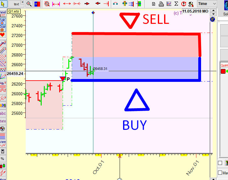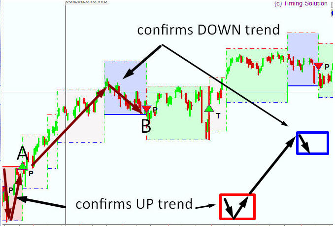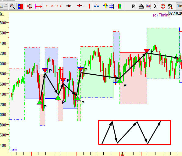 Thus, one and the same quantum figure provides two types of trading signals. We can call the first type of those signals "PRICING signals" and the second ones "TIMING signals". These signals are marked by symbols P (i.e. pricing) and T (i.e. timing) accordingly: