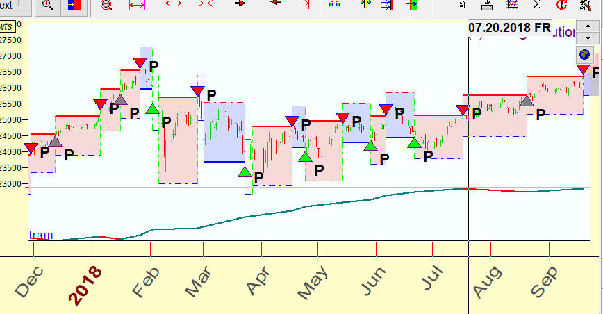 With this module, a trader gets a notice of critical price levels where the price tends to change its trend, together with possible dates where a trend change is more probable. In the example above, a blue rectangle generates the support level (buy signal) while a red rectangle shows the resistance level (sell signal).
