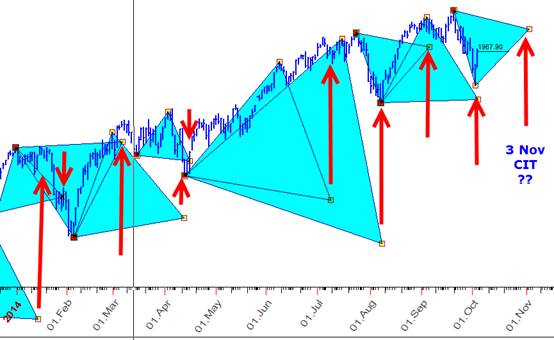 11. The following is a very basic quick example to illustrate the potential. It shows the triangles used to forecast the turn points illustrated in the first screen shot above. It is based on the S&P 500 as at 3 October 2014 (ie most recent prices when this was written). Look for potential price action around 3 November? (Note that the triangle point at 2 October may not be a valid turn point - it only looks like it could be using the data available at 3 October).