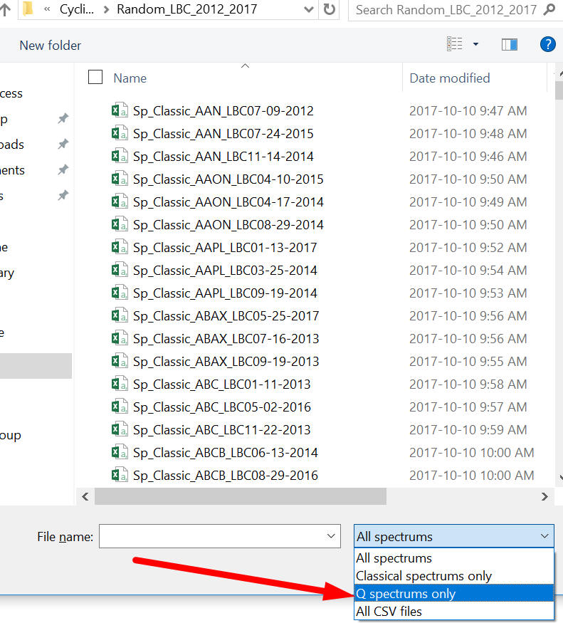 Ok, let's calculate high probability spectrum for cycles calculated with Q-Spectrum module. After clicking "Open" button, choose Random_LBC_2012_2017 folder and highlight the item Q spectrums only: