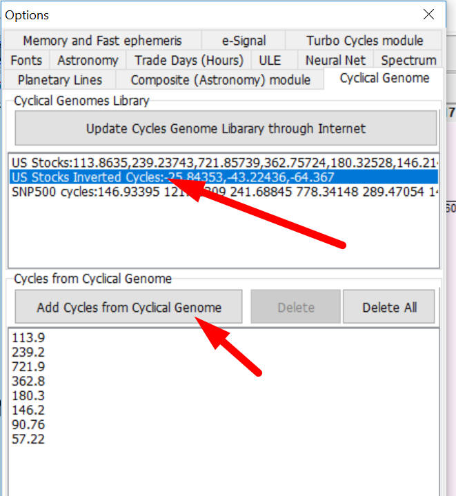 In Timing Solution you can display these inverted cycles in Q-Spectrum module. In order to do that in Options in Cyclical Genome tab highlight "US Stocks Inverted Cycles..." cycles library and click "Add Cycles from Cyclical Genome" button:
