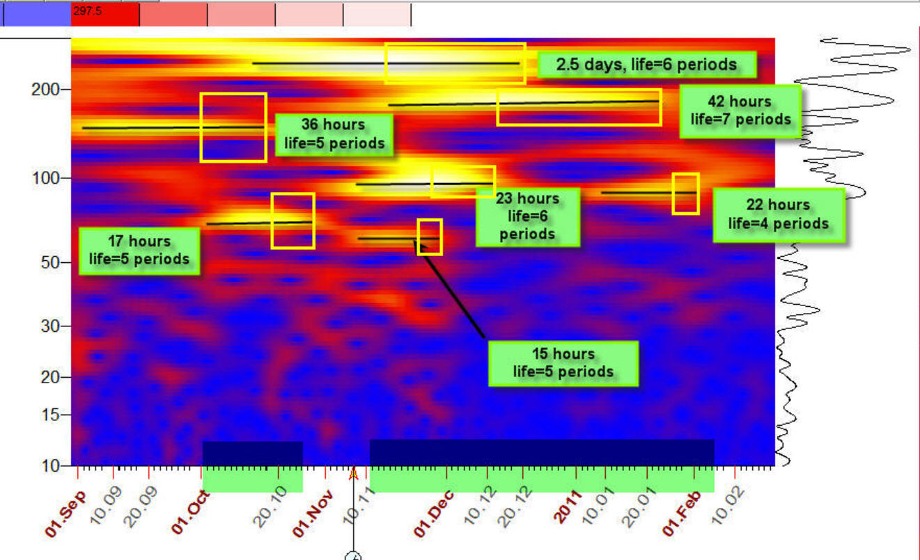 The yellow horizontal stripes above correspond to the cyclical activity. The cyclical life usually covers 3-7 full periods, for example, a 100 day cycle usually lives 300-700 days.