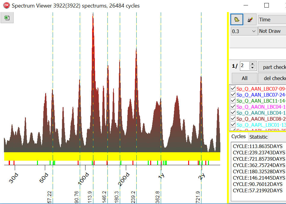 Thus you can see together the most important cycles for any financial instrument (Q-Spectrum chart) and cyclical genome that indicates the most probable cycles for 1300 American stocks.