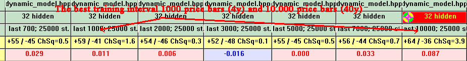 The program has trained the Neural Net based on that Dynamic Model, created the projection line and back tested it. Then the program has analyzed the back testing results from the point of view of the Statistics. The table above shows that, in attempt of getting a good (reliable) forecast, no more than 1000 price bars are enough to train the Neural Net. This corresponds to 4 years of price history data. Logically, if we add more data for training (8 years, or 12, or 20 years of price history), we should get better results. In reality, the results become worse - till we use about 10,000 price bars (which corresponds to 40 years of price history data).
