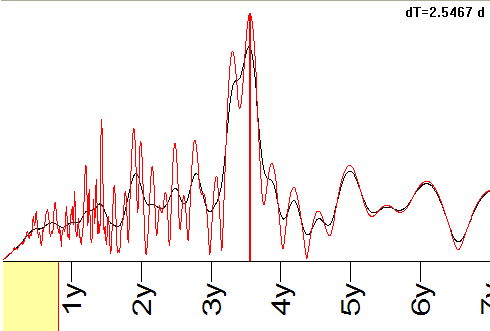 Thus, we have got the main cycle of 3.6 years (which is confirmed by the spectrum results for the real DJI data - see above). Besides, there is one more cycle with a period of 4.5 years approximately (for the real DJI data, it is 5 years).