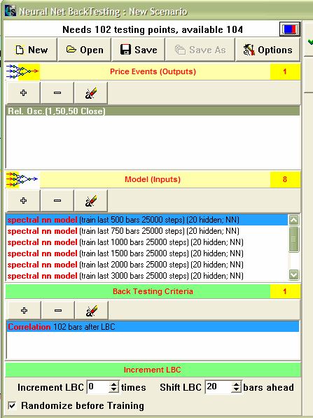 The first thing you should do is to find the optimal training interval for the Neural Net. "Optimal" means the interval that is enough to find the major important factors. We do it through Back Testing module: