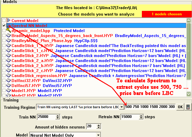 Here the program has calculated the Spectrum, extracted cycles and then created the Neural Net forecasting model using different amounts of price bars. We worked with 500, 750, 1000 ... price bars.