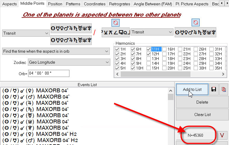 Example #1: a user is trying to make a forecast based on huge amount of midpoints. Technically Timing Solution allows you to create a list of midpoints aspects, like this list of 45K different midpoint aspects: