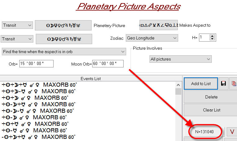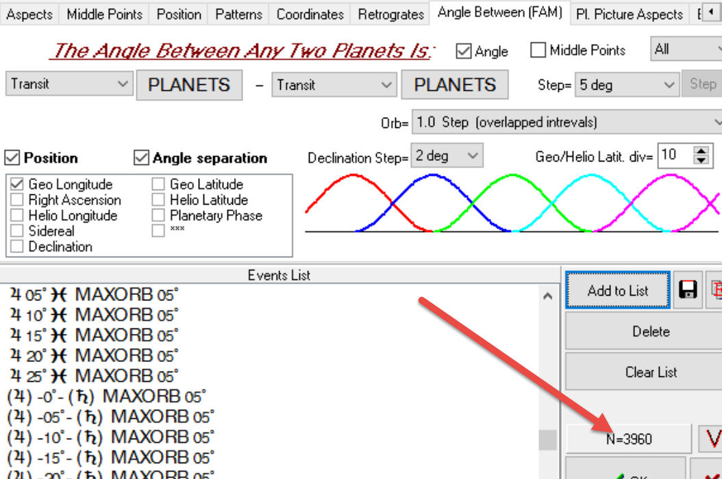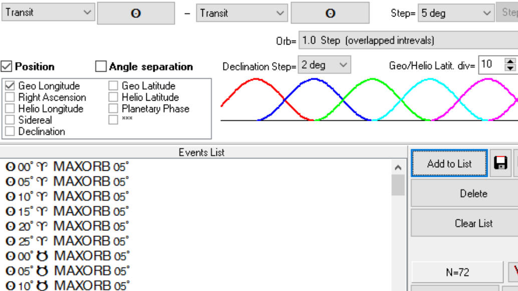 Here we used orb=5 degrees, i.e. we analyze events such as the Sun in 0 degree of Aries, 5 Aries, 10 Aries .... In total, it is 72 events for the Sun position. We can increase the orb => get less inputs and less accuracy; or decrease the orb => get more inputs.