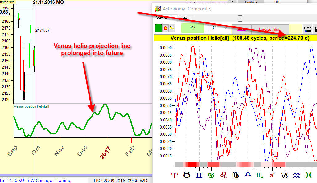 Example #2: with Timing Solution you can easily build a projection line based on any astronomical cycle. As an example, look at the projection line based on Venus heliocentric cycle; here it is: